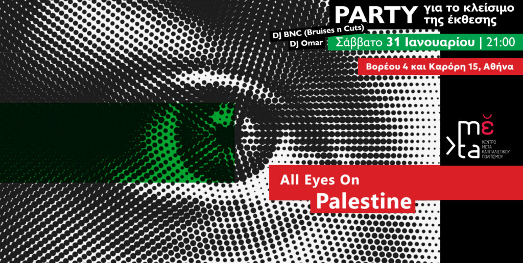 Το Σάββατο 31 Ιανουαρίου 2026 στις 21:00 στην καρδιά του ιστορικού κέντρου της Αθήνας (Καρόρη 15 & Βορέου 4), οργανώνουμε πάρτυ κλεισίματος της έκθεσης All Eyes on Palestine με τους ήχους των DJ BNC (Bruises n Cuts) και DJ Omar.